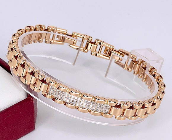 Не вызывающая аллергии бижутерия. Ювелирный сплав, покрытие — золото 585 пробы, вставки — фианиты. Длина 16,5 см — 19 см, ширина браслета 9 мм.