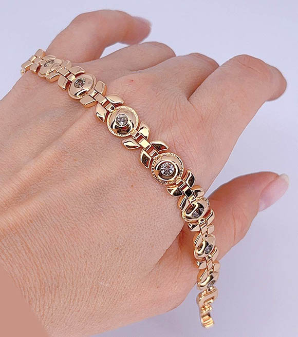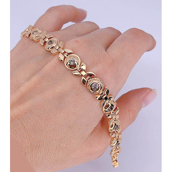 Не вызывающая аллергии бижутерия. Ювелирный сплав, покрытый золотом 585 пробы, вставки — фианиты. Размер браслета 19,5 см, ширина 9 мм.
