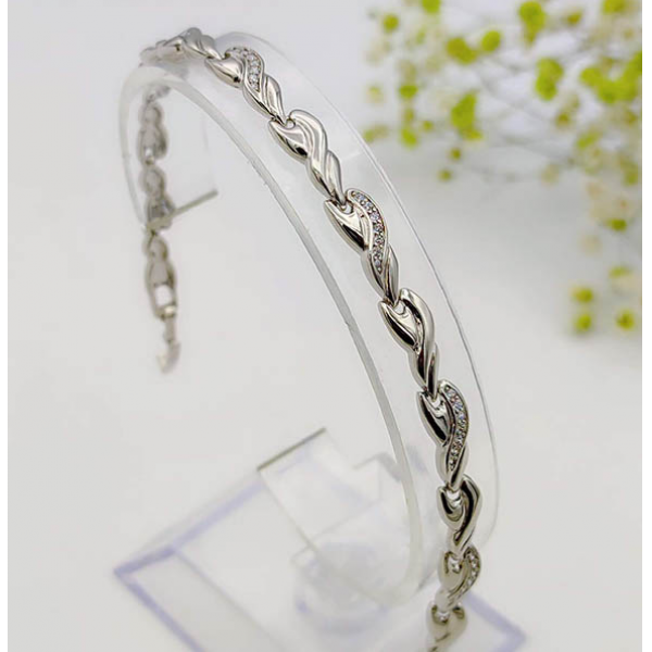 Гипоаллергенная бижутерия. Покрытый родием ювелирный сплав, вставки — фианиты. Размер 17 см плюс добор 2 см.