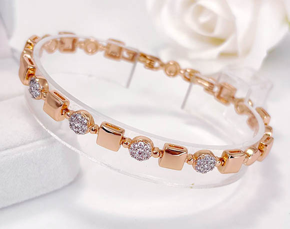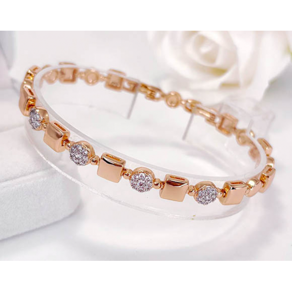 Позолоченный гипоаллергенный сплав (покрытие — из золота 585 пробы), вставки — фианиты. Размер 17 см + 2 см добор, ширина браслета 6 мм.