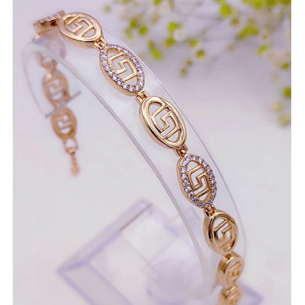 Позолоченный гипоаллергенный сплав (покрытие — из золота 585 пробы), вставки выполнены из фианитов. Длина браслета 16,5 см+ добор 2 см, ширина 8 мм.