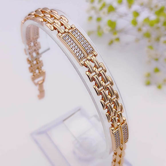 Позолоченный гипоаллергенный сплав (покрытие —золото 585 пробы), вставки — фианиты. Длина браслета 18,5 см, ширина 9 мм.