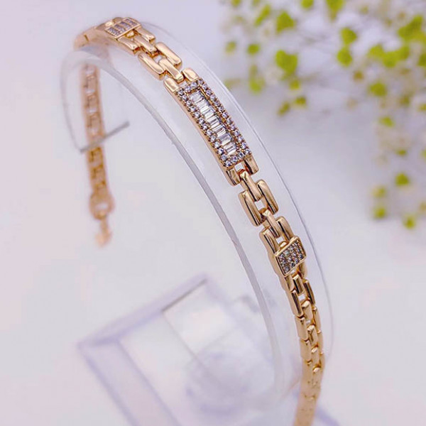 Позолоченный гипоаллергенный сплав (покрытие —золото 585 пробы), вставки выполнены из фианитов. Длина 19 см, ширина браслета 5 мм.