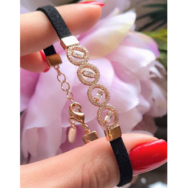 Основа — черный текстиль, ювелирный сплав, гипоаллергенное покрытие из золота 585 пробы, вставки — фианиты. Длина браслета 16,5 см — 19,5 см.