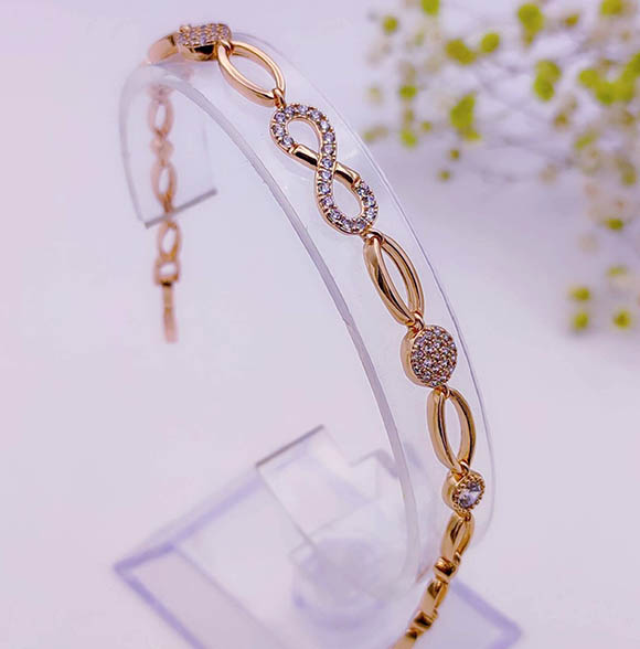 Позолоченный гипоаллергенный сплав (покрытие —золото 585 пробы), вставки — фианиты. Размер 17 см плюс добор 2 см.
