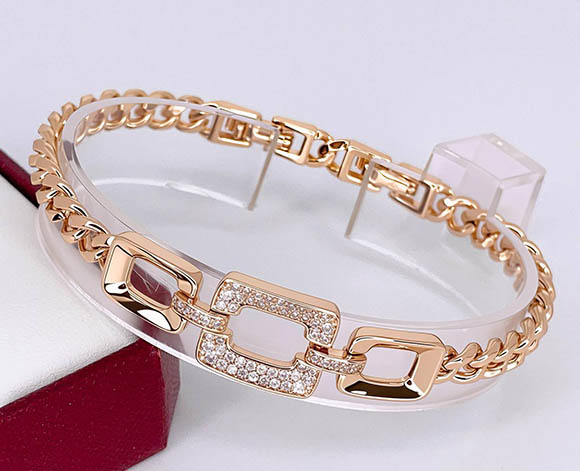 Гипоаллергенный сплав, покрытие из золота 585 пробы, вставки — фианиты. Длина браслета 17см —19 см, ширина 13 мм.