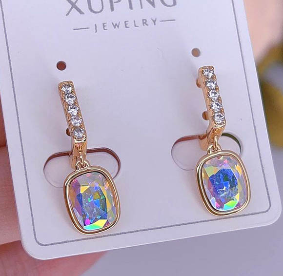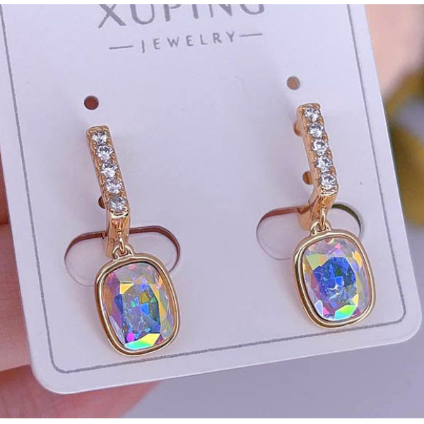Не вызывающая аллергии бижутерия. Ювелирный сплав, покрытие — золото 585 пробы, вставки выполнены из кристаллов Сваровски. Высота серег 2,2 см, английский замок.