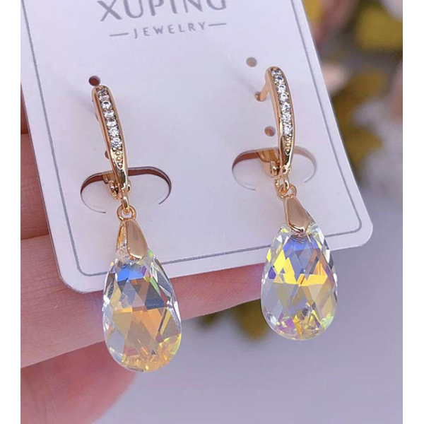 Гипоаллергенная бижутерия. Ювелирный сплав, покрытие выполнено из золота 585 пробы, вставки — кристаллы Сваровски. Размер серег 3,5 см, английский замок.