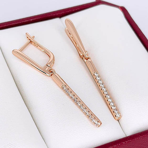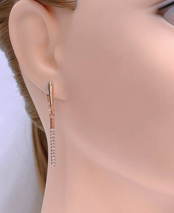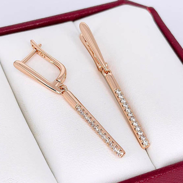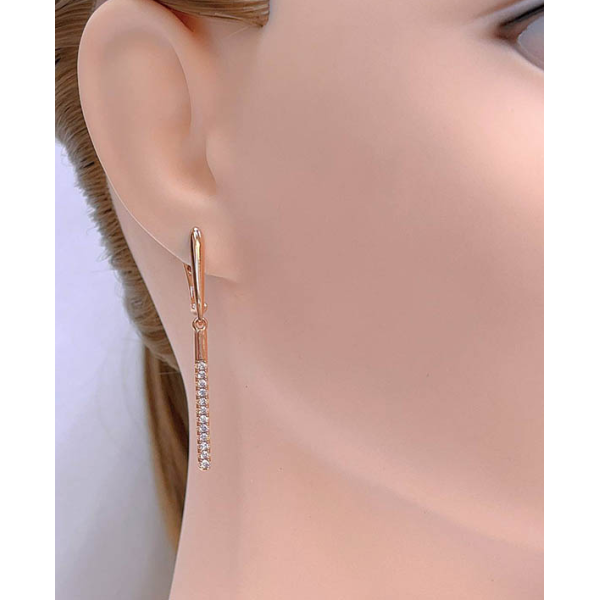 Позолоченный гипоаллергенный сплав (покрытие —золото 585 пробы), вставки — фианиты. Длина серег 4,7 см, английский замок.