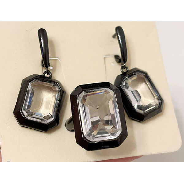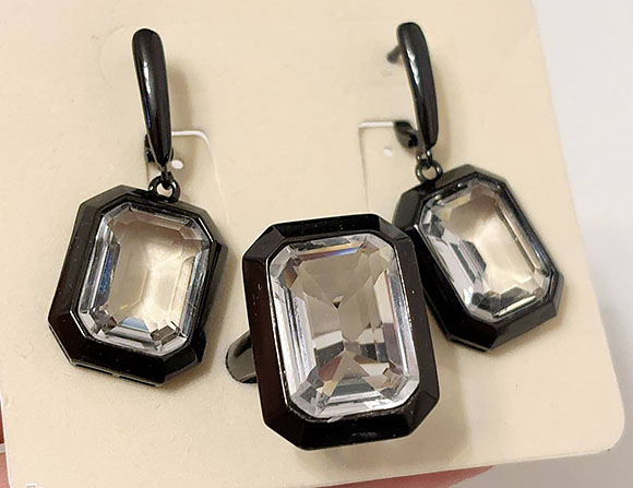 Не вызывающая аллергии бижутерия. Ювелирный сплав, покрытие — черный родий, вставки выполнены из фианитов. Длина 3,8 см, английский замок. Размеры кольца: 19. Остался 1 набор.