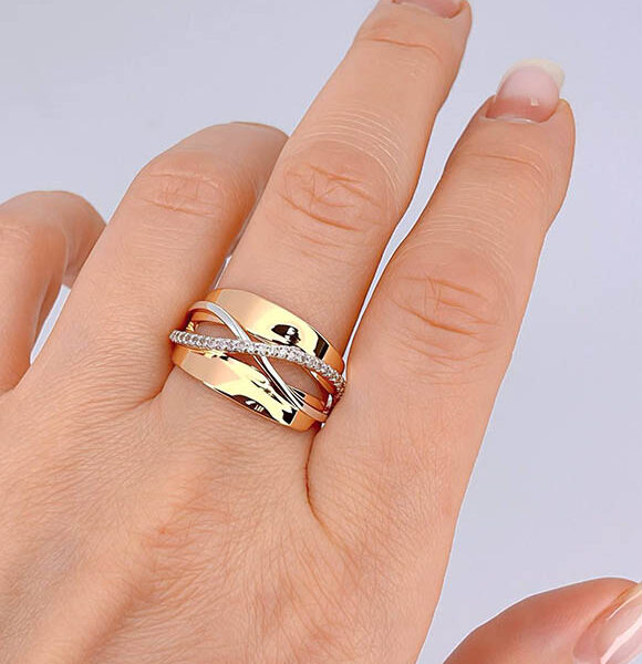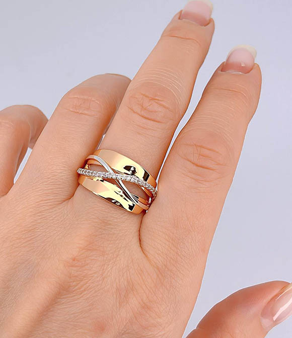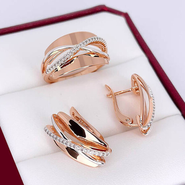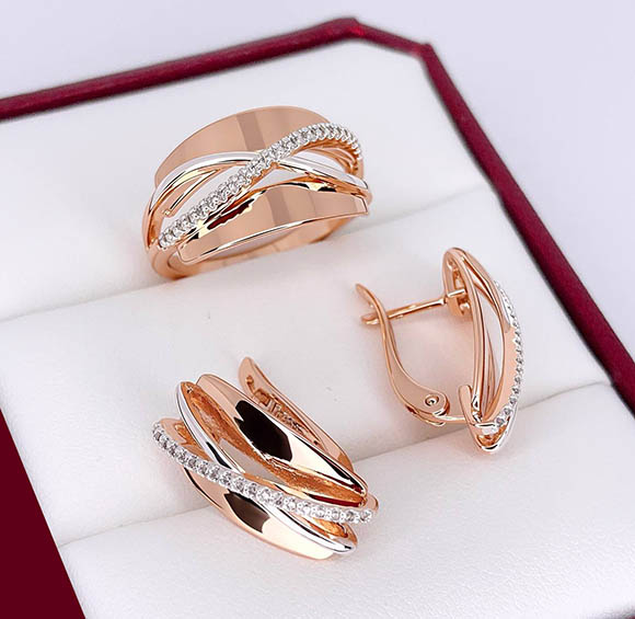 Гипоаллергенная бижутерия. Ювелирный сплав, покрытие — золото 585 пробы и родий, вставки — фианиты. Длина серег 2,3 см, английский замок. Размеры кольца: 20,5. Остался 1 комплект.