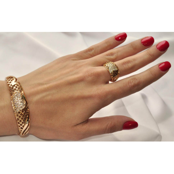 Гипоаллергенная бижутерия. Покрытый золотом 585 пробы ювелирный сплав, вставки из фианитов. Окружность браслета 18-19-20 см, размеры кольца: 19. Остался 1 комплект.