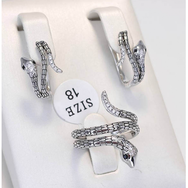 Ювелирный сплав, гипоаллергенное покрытие из родия, вставки выполнены из фианитов. Размер серег 1,8 см, английский замок. Размеры кольца: 18. Остался 1 комплект.