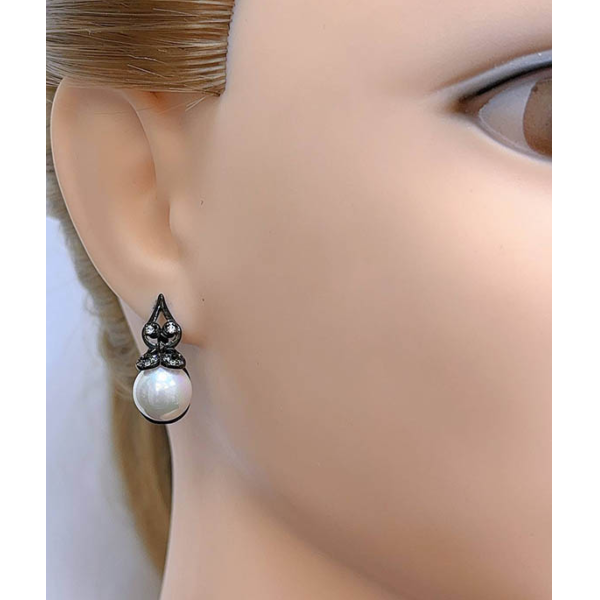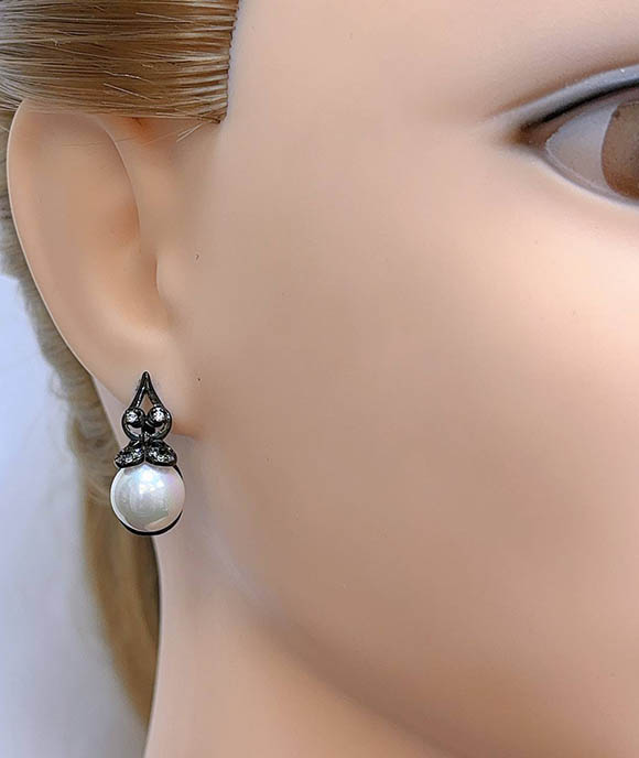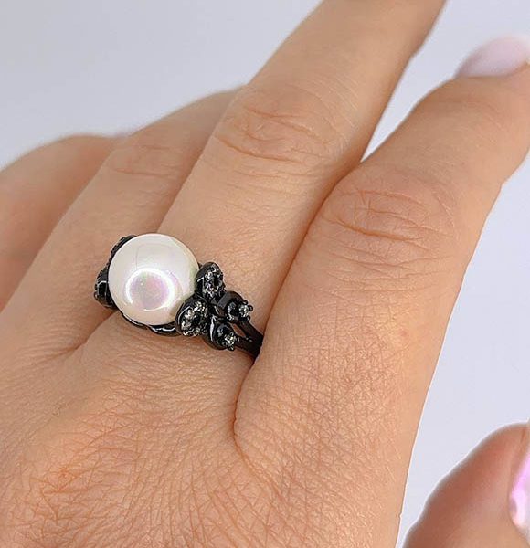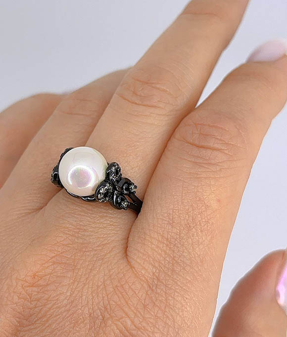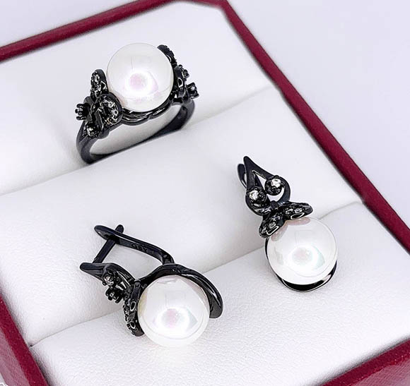 Гипоаллергенная бижутерия. Ювелирный сплав, покрытие — черный родий, вставки — жемчуг и фианиты. У серег английский замок. Размеры кольца: 18. Остался 1 комплект.