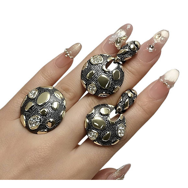 Гипоаллергенная бижутерия. Ювелирный сплав, покрытие выполнено из черного родия и желтого золота, вставки фианиты. У серег итальянский замок. Размеры кольца: 17; 18; 19; 20.