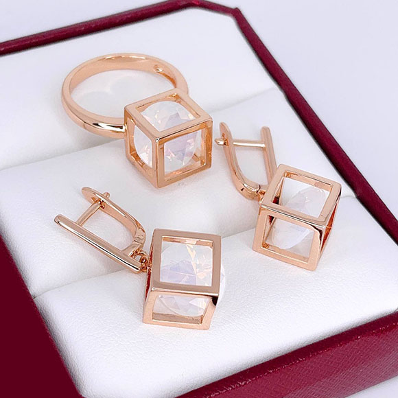 Ювелирный сплав, гипоаллергенное золотое покрытие (из золота 585 пробы), вставки — фианиты. Высота серег 3,5 см, английский замок. Размеры кольца: 19. Остался 1 комплект.