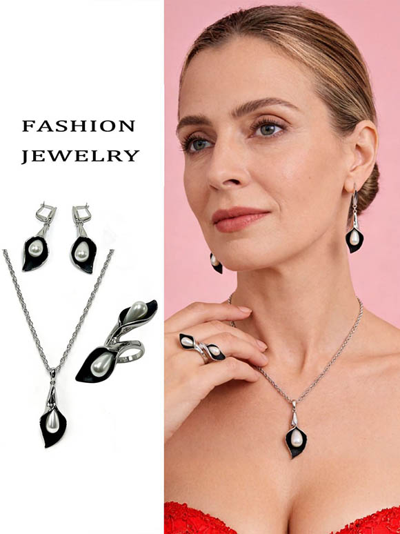Не вызывающая аллергии бижутерия. Ювелирный сплав, покрытие — родий и черный родий, вставки — жемчуг. У серег английский замок. Размеры кольца: 17; 18; 19; 20. Серьги, кольцо или кулон с цепочкой можете приобрести отдельно.