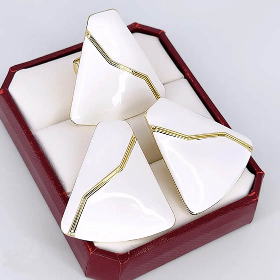 Гипоаллергенные украшения. Покрытый золотом 750 пробы бижутерный сплав, вставки — белая эмаль. У серег итальянский замок. Размеры кольца: 18; 19.