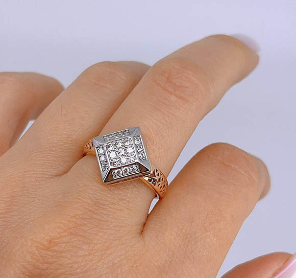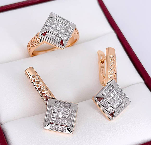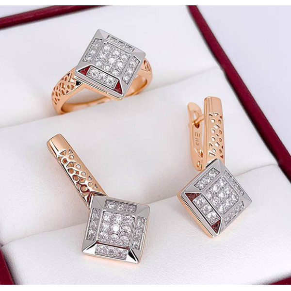 Гипоаллергенный сплав, покрытие из золота 585 пробы и родия, вставки — фианиты. У серег английский замок. Размеры кольца: 17; 18; 19. Осталось 3 набора.