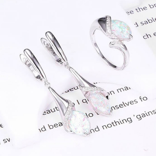 Гипоаллергенная бижутерия. Ювелирный сплав, покрытие — родий, вставки выполнены из опала и фианитов. Высота серег 4,2 см, английский замок. Размер кольца: 17; 18; 19; 20.