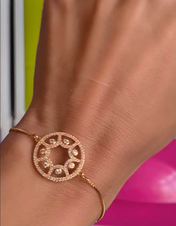 Гипоаллергенная бижутерия. Ювелирный сплав, покрытие — золото 585 пробы, вставки из фианитов. Длина 18+3 см, диаметр вставки 2,4 см.