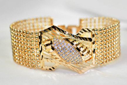 Ювелирный сплав, гипоаллергенное золотое покрытие (золото 585 пробы), фианитовые вставки. Длина 19,5 см, ширина 2,5 см, центральный элемент 3,5 х 3 см.