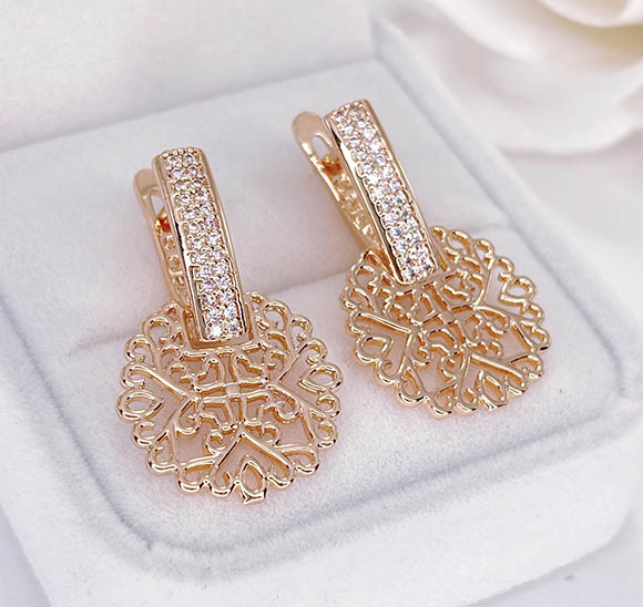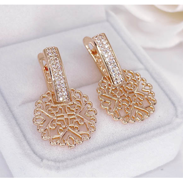 Гипоаллергенная бижутерия. Покрытый золотом 585 пробы ювелирный сплав, вставки — фианиты. Размер серег 2,9 см, английский замок.