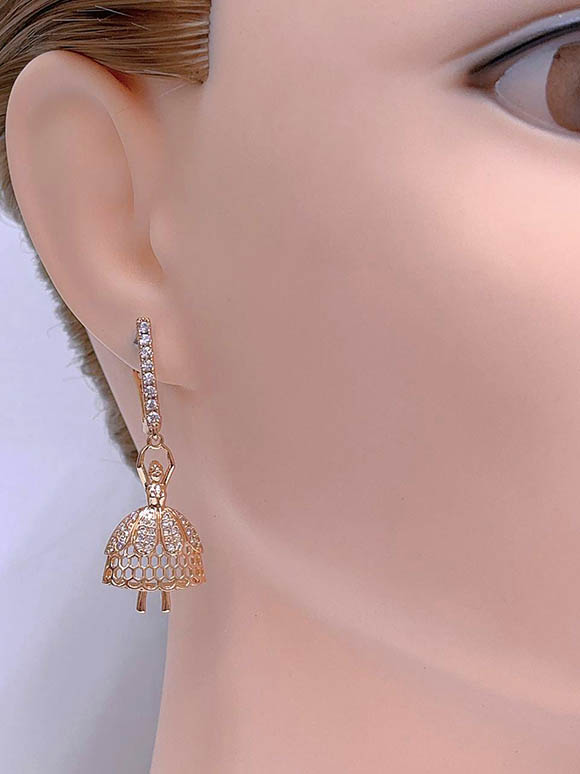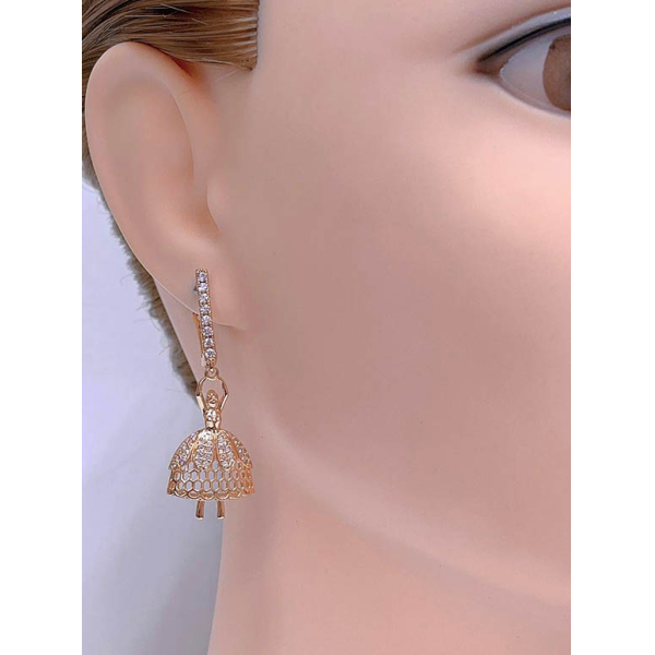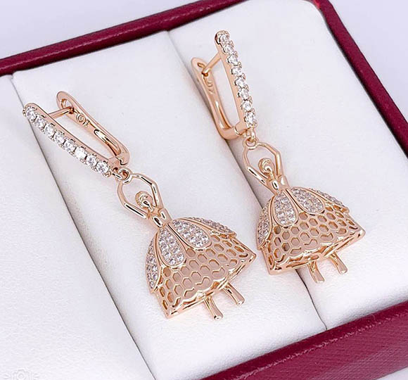 Гипоаллергенная бижутерия. Ювелирный сплав, покрытие выполнено из золота 585 пробы, вставки — фианиты. Размер серег 4,4 см, английский замок.