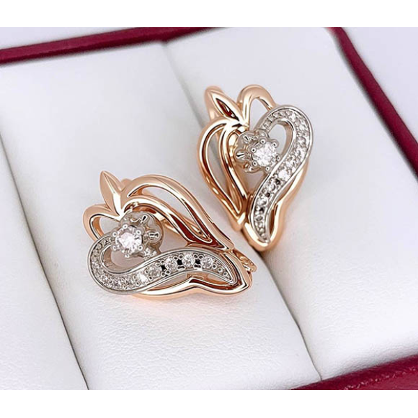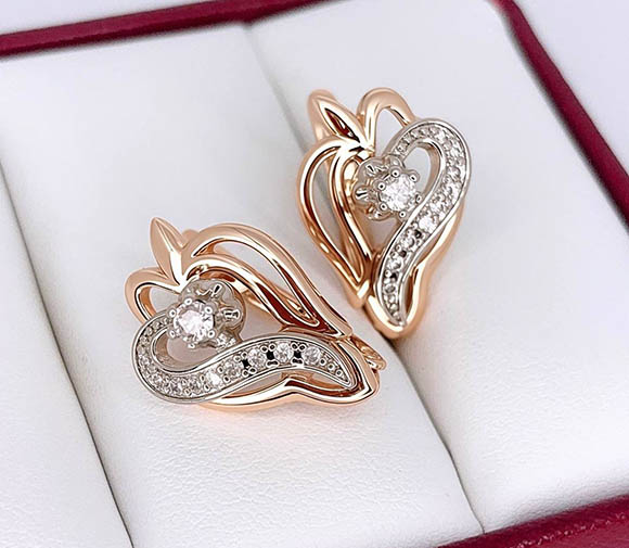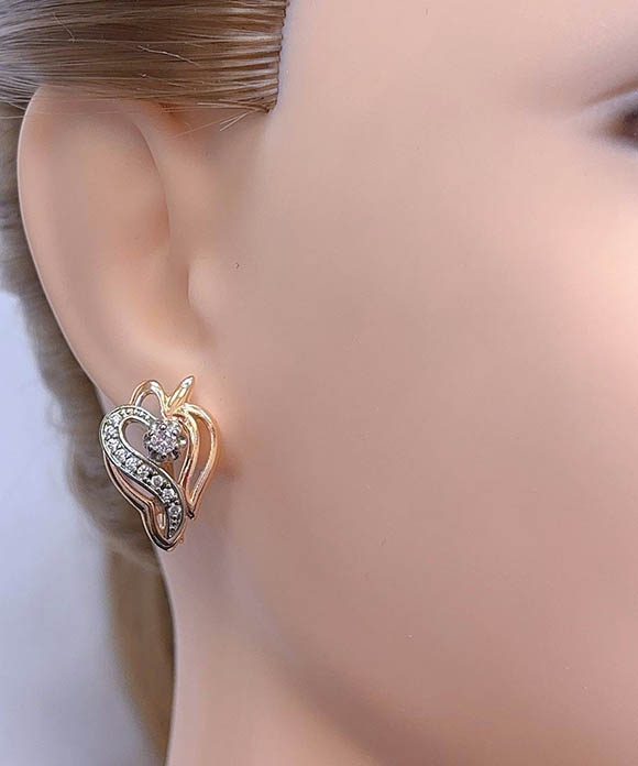Не вызывающая аллергии бижутерия. Ювелирный сплав, покрытие — золото 585 пробы и родий, вставки — фианиты. Размер 2,2 см, английский замок.