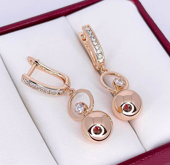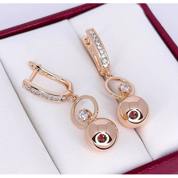 Гипоаллергенная бижутерия. Ювелирный сплав, покрытие — золото 585 пробы, вставки — фианиты. Высота серег 3,6 см, английский замок.