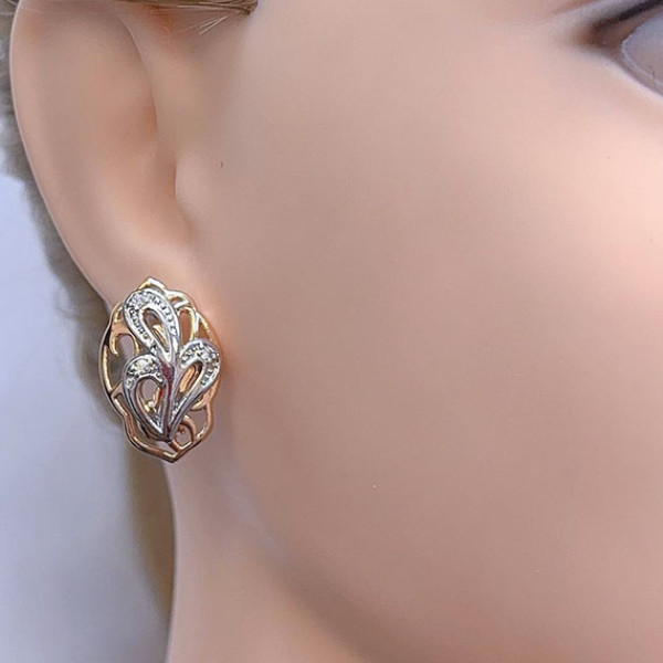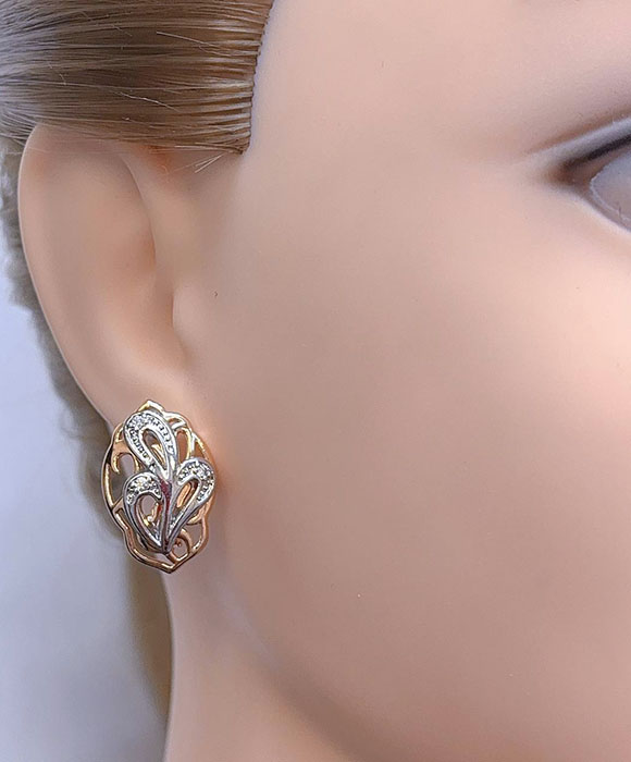 Не вызывающая аллергии бижутерия. Ювелирный сплав, покрытие — золото 585 пробы и родий, вставки — фианиты. Длина серег 2,4 см, английский замок.