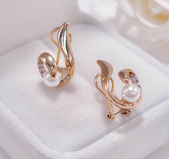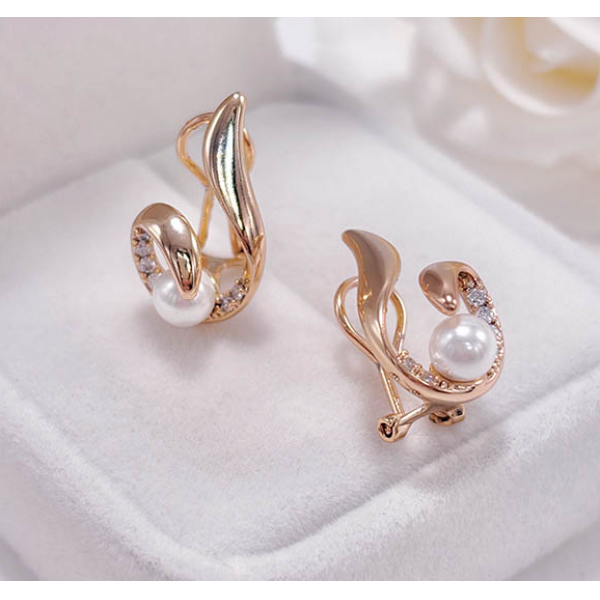 Позолоченный гипоаллергенный сплав (покрытие —золото 585 пробы), вставки выполнены из жемчуга и фианитов. Высота 1,8 см, итальянский замок.