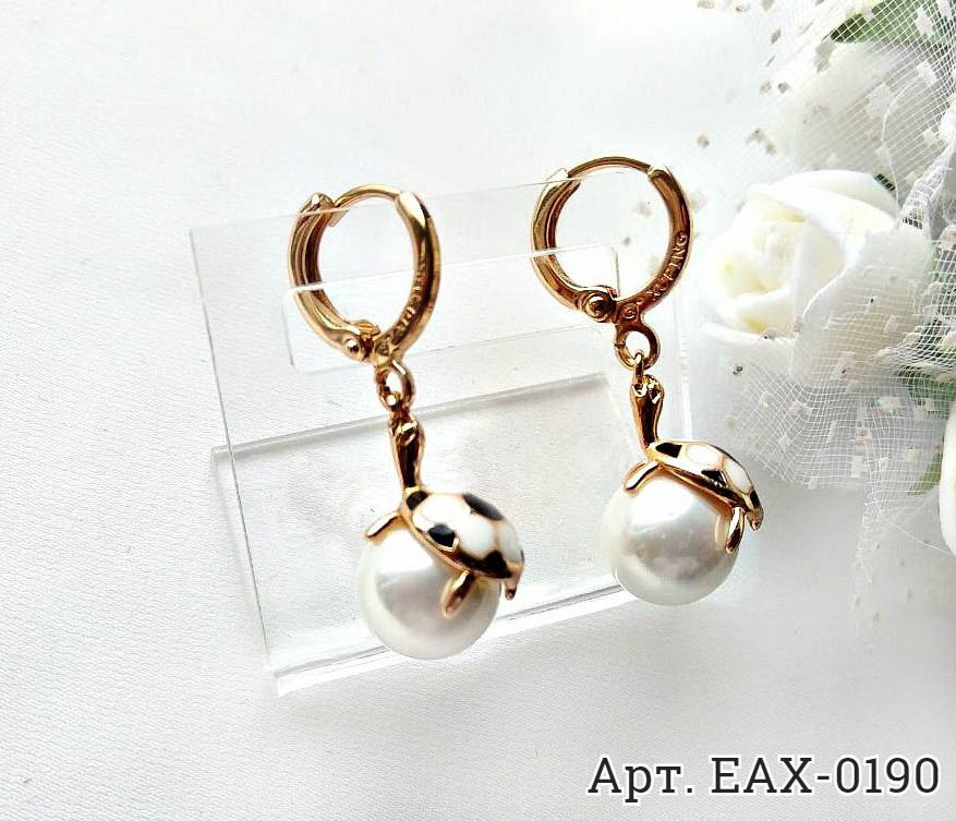 Не вызывающая аллергии бижутерия. Ювелирный сплав с покрытием из золота 585 пробы, вставки — эмаль и эмаль. Длина серег 3 см.
