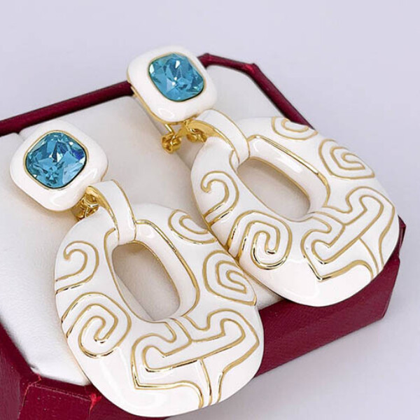 Не вызывающая аллергии бижутерия. Ювелирный сплав, покрытый золотом 585 пробы, вставки — фианиты и эмаль. Высота серег 6,5 см, итальянский замок.
