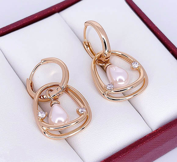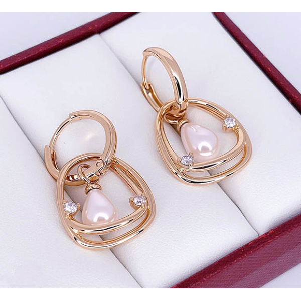 Гипоаллергенная бижутерия. Ювелирный сплав, покрытие выполнено из золота 585 пробы, вставки — жемчуг и фианиты. Высота 3,3 см, замок кольцо.