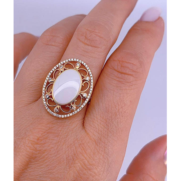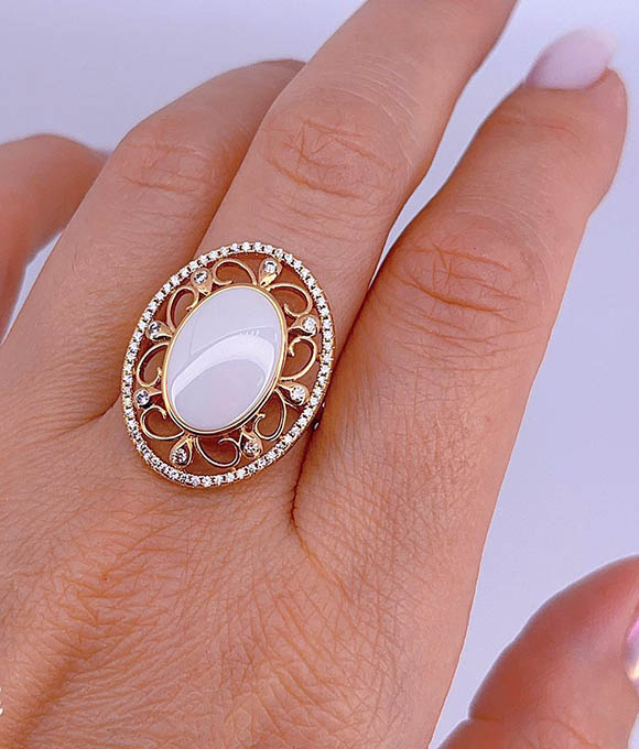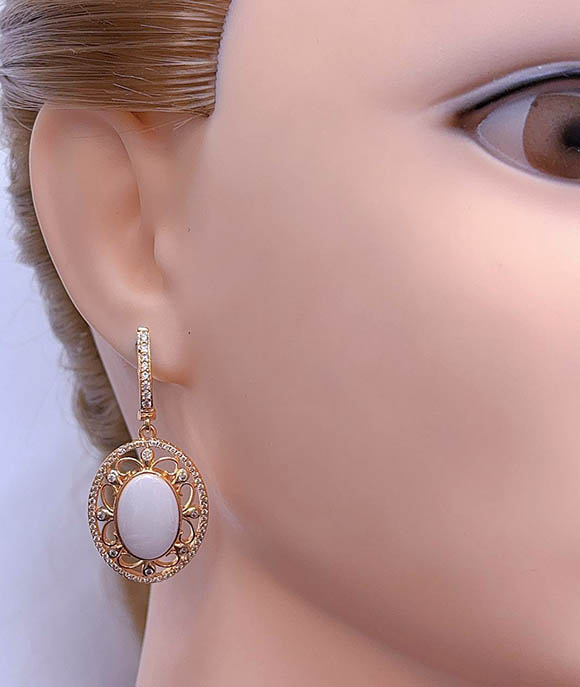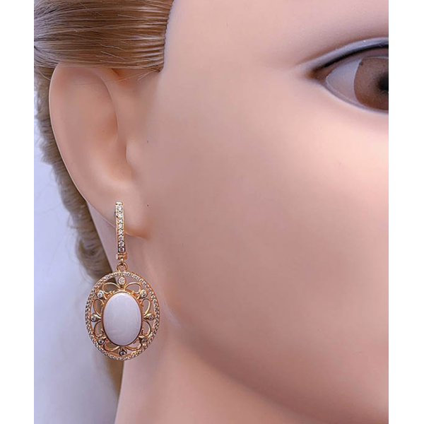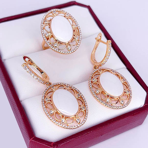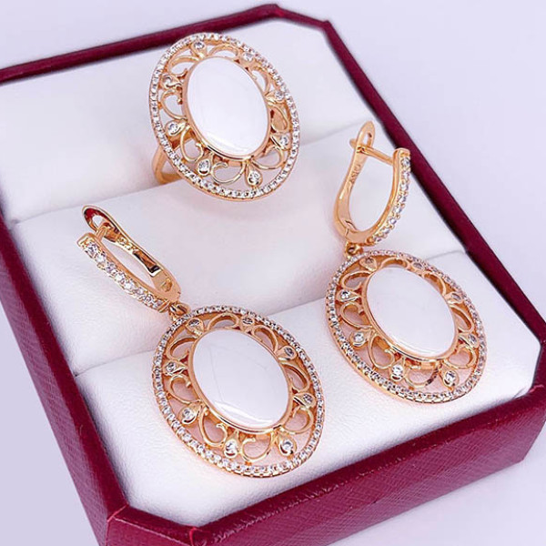 Не вызывающая аллергии бижутерия. Ювелирный сплав, покрытие — золото 585 пробы, вставки — белая керамика и фианиыт. Длина серег 4,4 см, английский замок. Размеры кольца: 18. Остался 1 комплект.