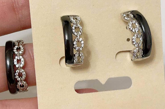 Гипоаллергенный сплав, покрытие из родия, вставки — керамика и фианиты. У серег английский замок. Размеры кольца: 17. Остался 1 комплект.
