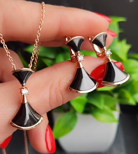 Не вызывающая аллергии бижутерия. Ювелирный сплав, покрытый золотом 585 пробы, вставки — черная керамика и фианиты. Высота серег 2,5 см, английский замок. Цепочка 36 см+ 4 см, длина кулона 2,5 см.