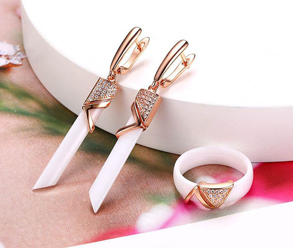 Гипоаллергенный сплав, покрытие выполнено из золота 585 пробы, вставки — белая керамика и фианиты. Высота серег 5,5 см, английский замок. Размеры кольца: 17; 18; 19; 20.