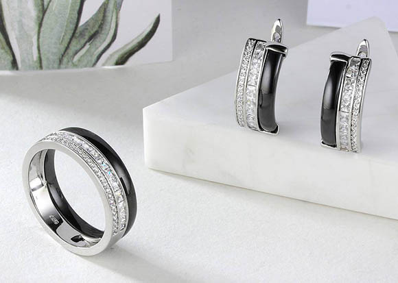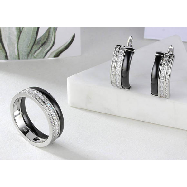 Гипоаллергенная бижутерия. Покрытый родием ювелирный сплав, вставки — керамика и фианиты. Высота серег 1,9 см, английский замок. Размеры кольца: 17; 18; 19; 20.