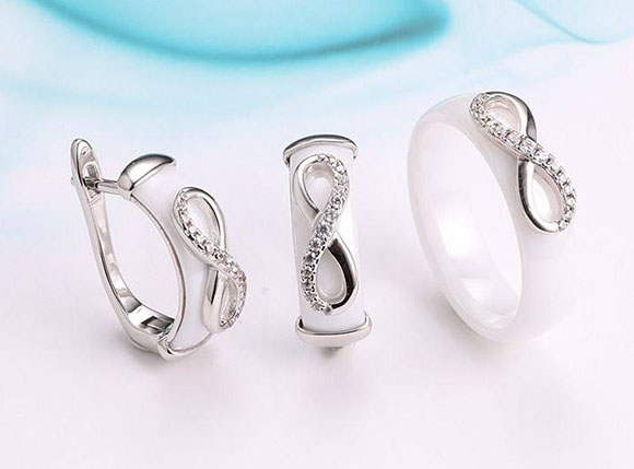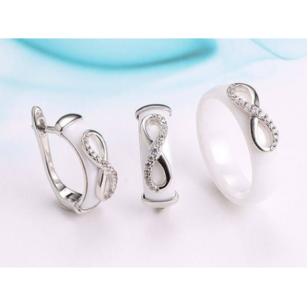 Гипоаллергенная бижутерия. Ювелирный сплав, покрытие — родий, вставки выполнены из белой керамики и фианитов. Длина серег 2 см, английский замок. Размеры кольца: 17; 18; 19; 20.
