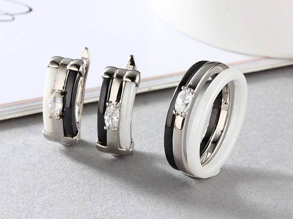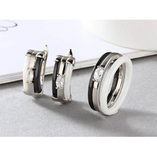 Не вызывающая аллергии бижутерия. Ювелирный сплав, покрытие — родий, вставки — керамика и фианиты. Длина серег 1,8 см, английский замок. Размеры кольца: 17; 18; 19; 20.
