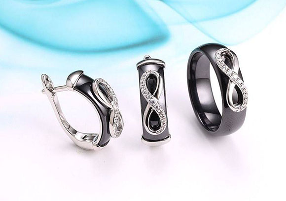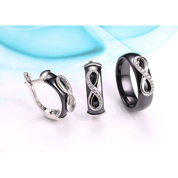 Гипоаллергенная бижутерия. Ювелирный сплав, покрытие выполнено из родия, вставки — черная керамика и фианиты. Размер серег 2 см, английский замок. Размеры кольца: 17; 18; 19; 20.