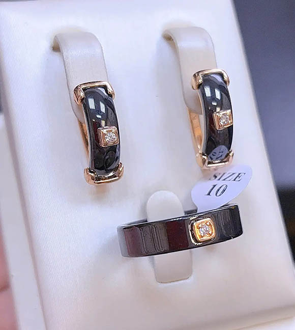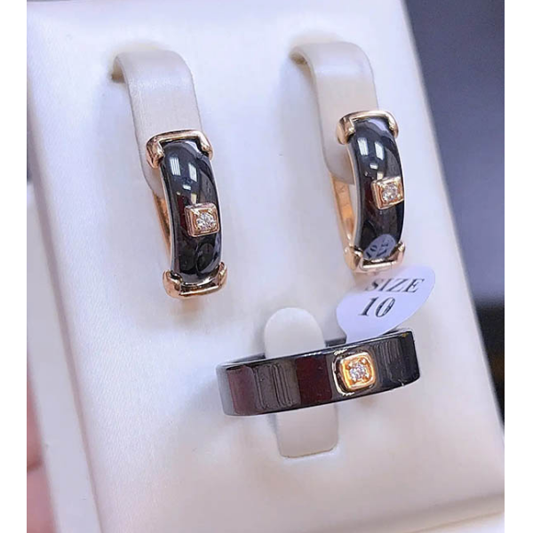 Гипоаллергенный сплав, покрытие выполнено из золота 585 пробы, вставки — керамика и фианиты. У серег английский замок. Размеры кольца: 17; 18; 19; 20.