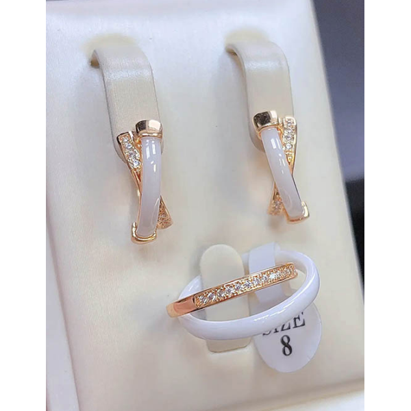 Гипоаллергенная бижутерия. Ювелирный сплав, покрытие выполнено из золота 585 пробы, вставки — белая керамика и фианиты. У серег английский замок. Размеры кольца: 17; 18; 19; 20.