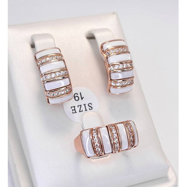 Не вызывающая аллергии бижутерия. Ювелирный сплав, покрытый золотом 585 пробы, вставки выполнены из керамики и фианитов. Высота серег 2,3 см, английский замок. Размеры кольца: 19.