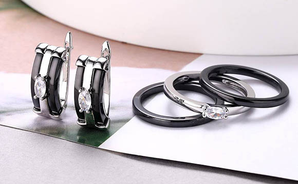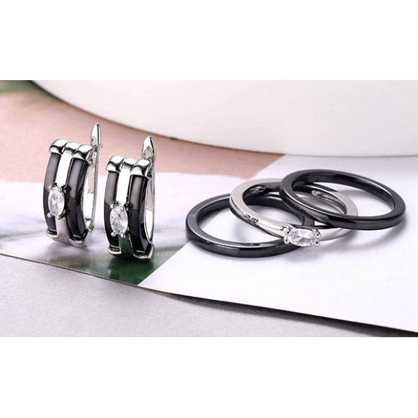 Гипоаллергенная бижутерия. Покрытый родием ювелирный сплав, вставки выполнены из черной керамики и фианитов. Размер серег 1,8 см, английский замок. Размеры кольца: 17; 18; 19; 20.