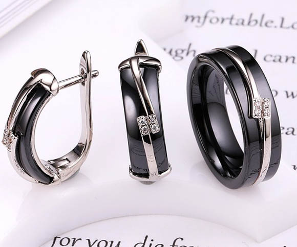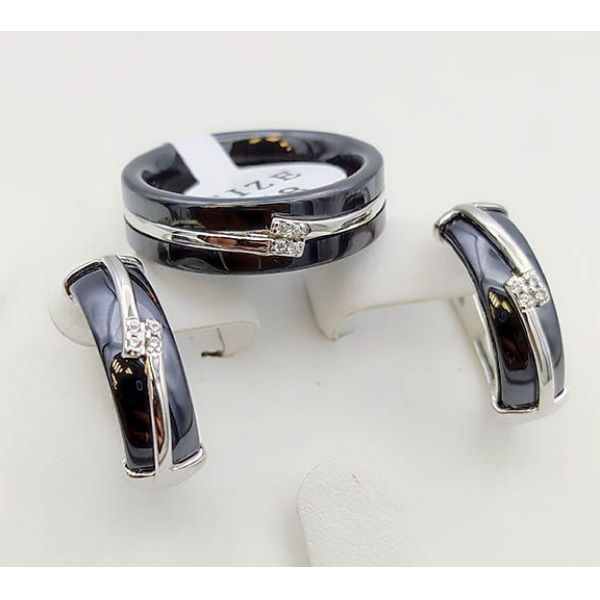 Гипоаллергенная бижутерия. Ювелирный сплав, покрытие выполнено из родия, вставки — керамика и фианиты. Длина серег 2 см, английский замок. Размер кольца: 17; 18; 19; 20.