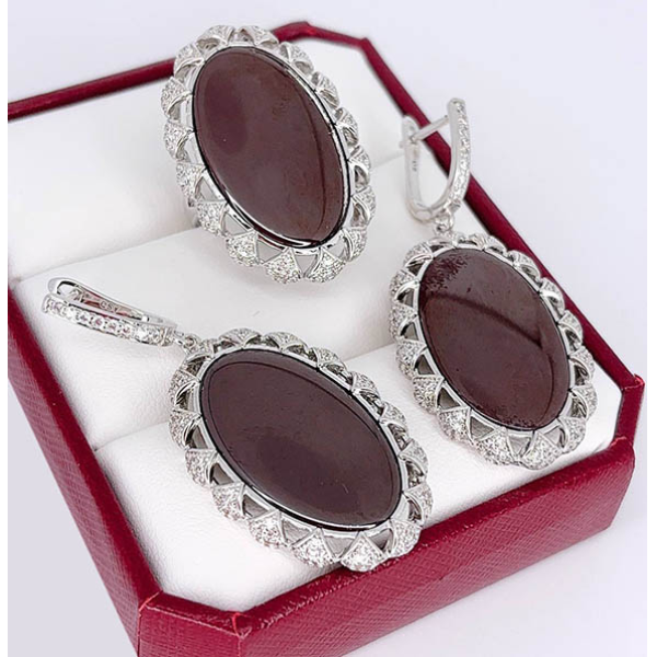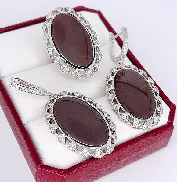 Гипоаллергенная бижутерия. Ювелирный сплав, покрытие — родий, вставки — керамика и фианиты. Длина серег 5,3 см, английский замок. Размеры кольца: 17. Остался 1 комплект.