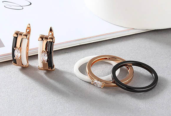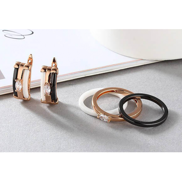 Гипоаллергенная бижутерия. Покрытый золотом 585 пробы ювелирный сплав, вставки — белая и черная керамика и фианиты. Длина серег 1,8 см, английский замок. Размеры кольца: 17; 18; 19; 20.